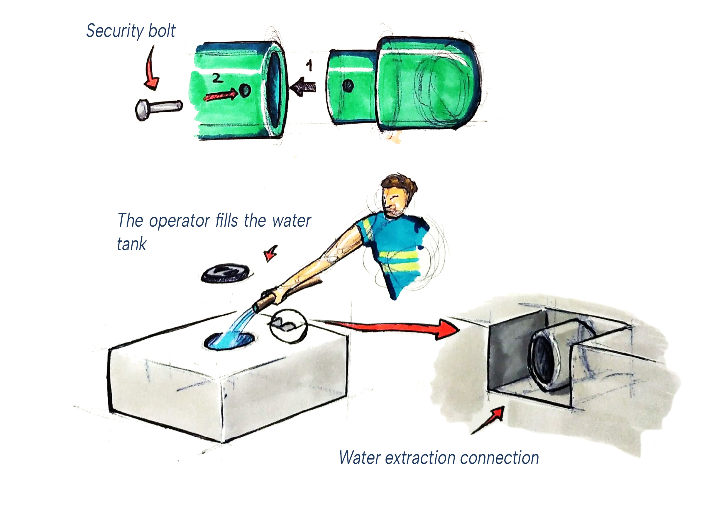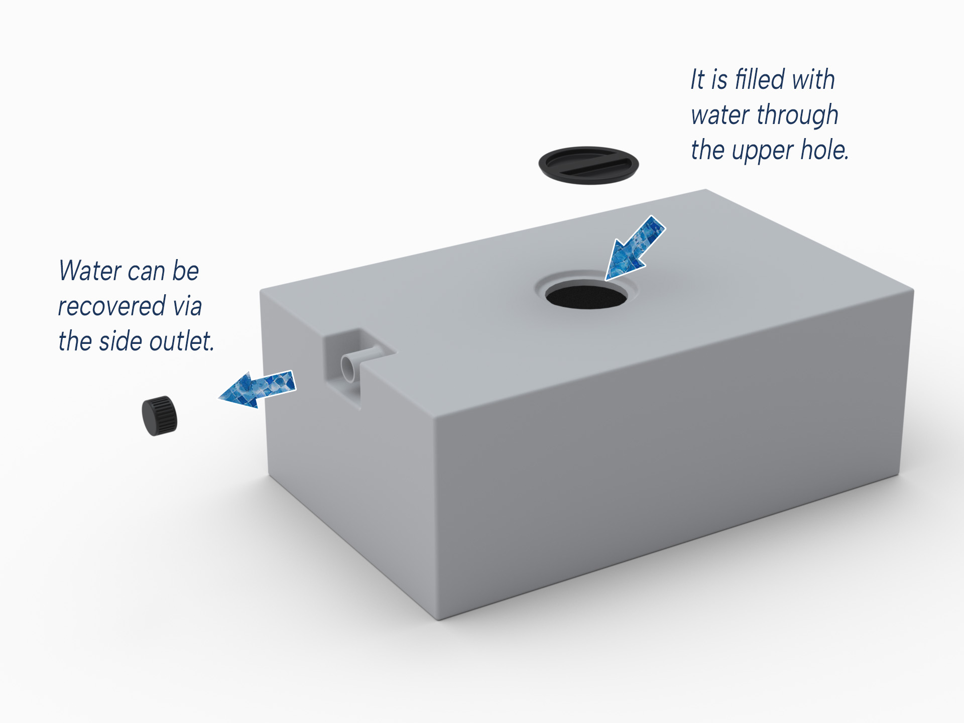 The stability of the structure is achieved by a counterweight that can be filled and emptied with water, which is placed on a web of sling tape attached to the main structure.